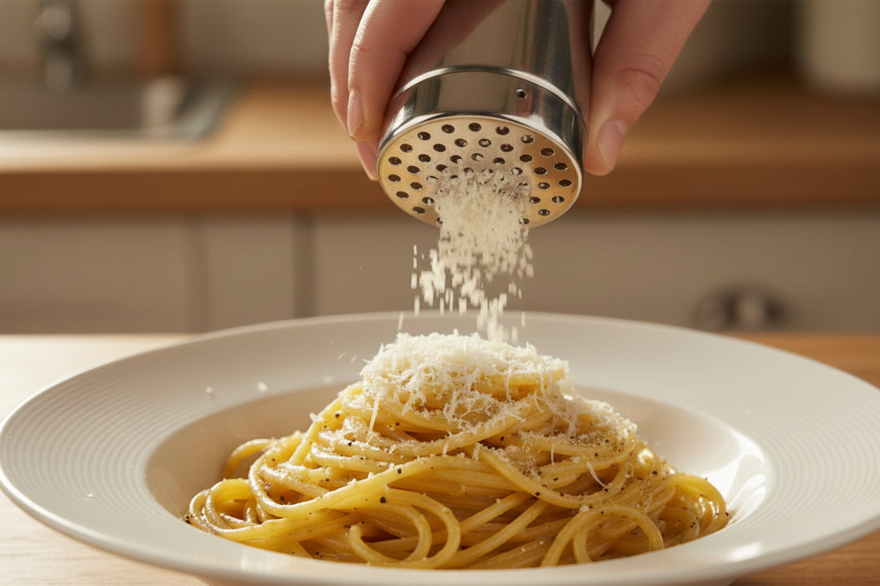 Espolvorea un poco de queso parmesano o un poco de ají picante sobre la pasta. Este dispensador de acero inoxidable con tornillo en la parte superior es una excelente adición a cualquier cocina.
